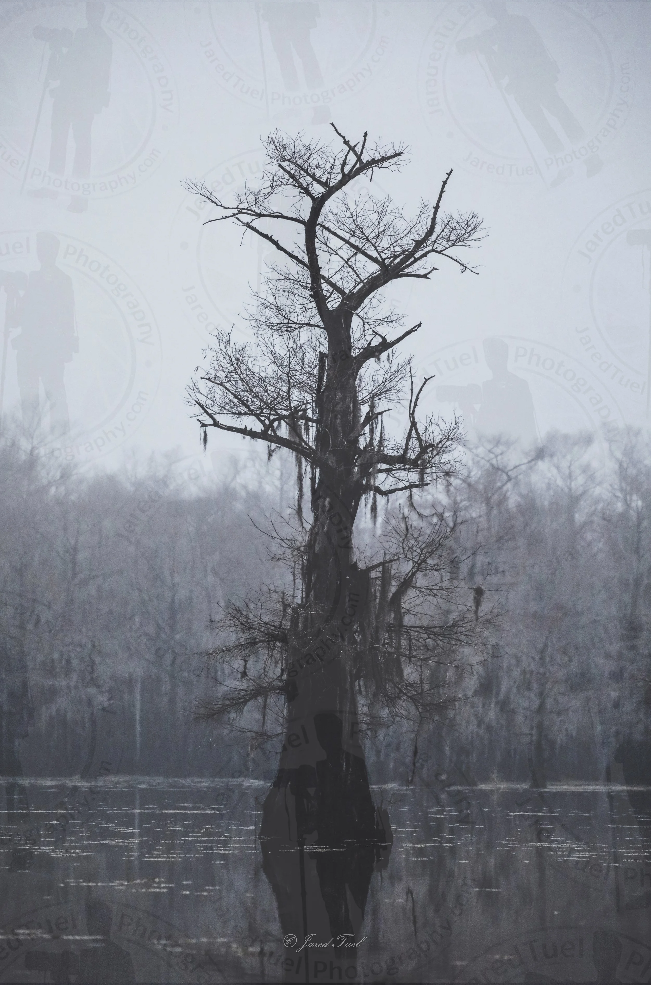 A lone cypress rises solemnly from the misty waters, its bare branches reaching upward like weathered arms etched against the gray dawn. Draped in threads of moss and reflected in the dark mirror below, the tree stands as a haunting emblem of endurance and solitude. The muted tones and fog-shrouded forest beyond lend the scene an ethereal calm-where silence feels alive, and time seems to linger between breaths.