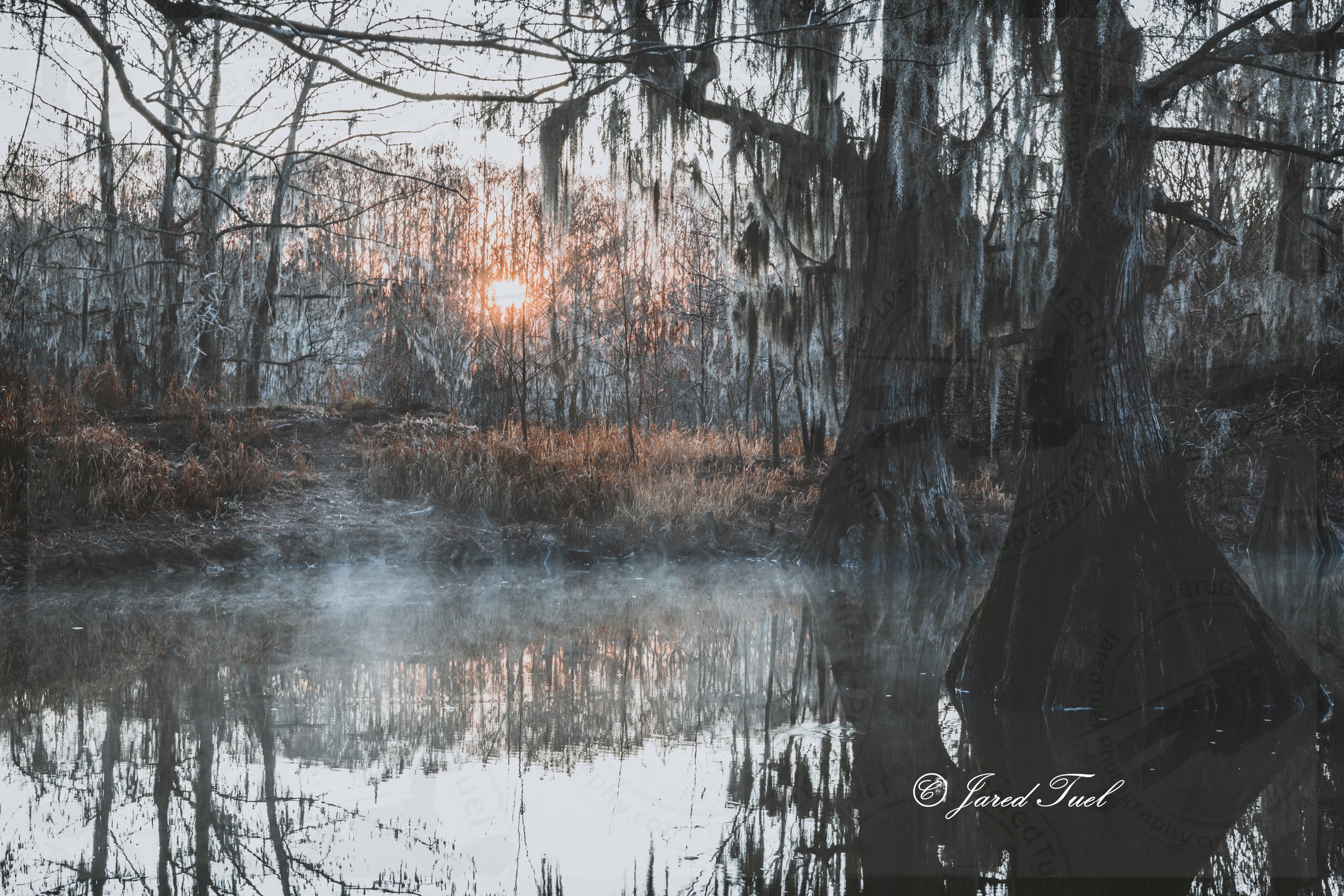 First light filters through the ancient cypress of Caddo Lake, where Spanish moss hangs like soft veils between sky and water. A thin layer of mist drifts across the still surface, blurring reflections and quieting the world. The rising sun warms the cool tones of the bayou, touching the trees with a gentle glow as the lake exhales its morning fog. The scene feels hushed and timeless-a moment where water, forest, and light exist in perfect, unspoken harmony.