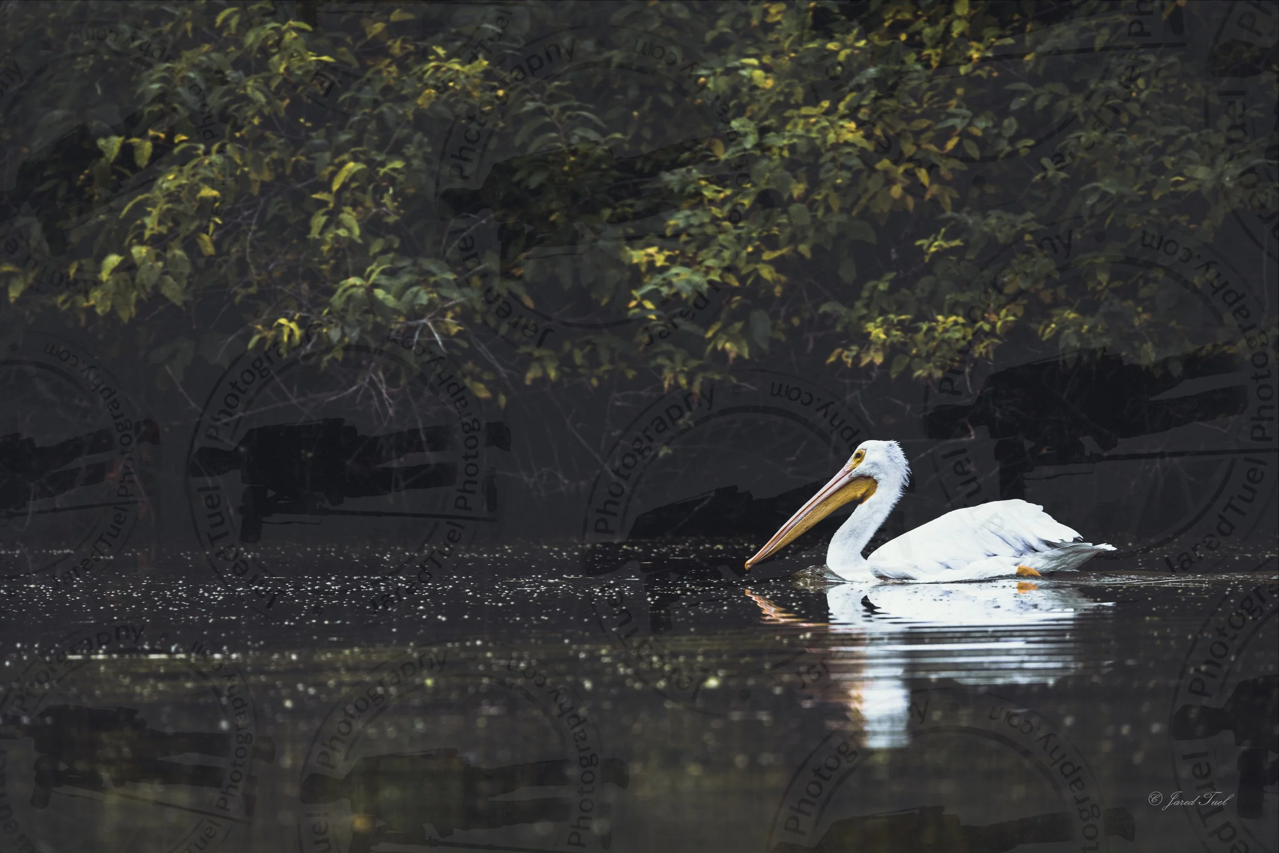 A lone white pelican glides effortlessly across the glassy surface of a dark river, its reflection rippling softly beneath it. Dense green foliage frames the scene, casting the water in deep shadow and drawing the eye to the bird’s bright plumage and long, amber bill.