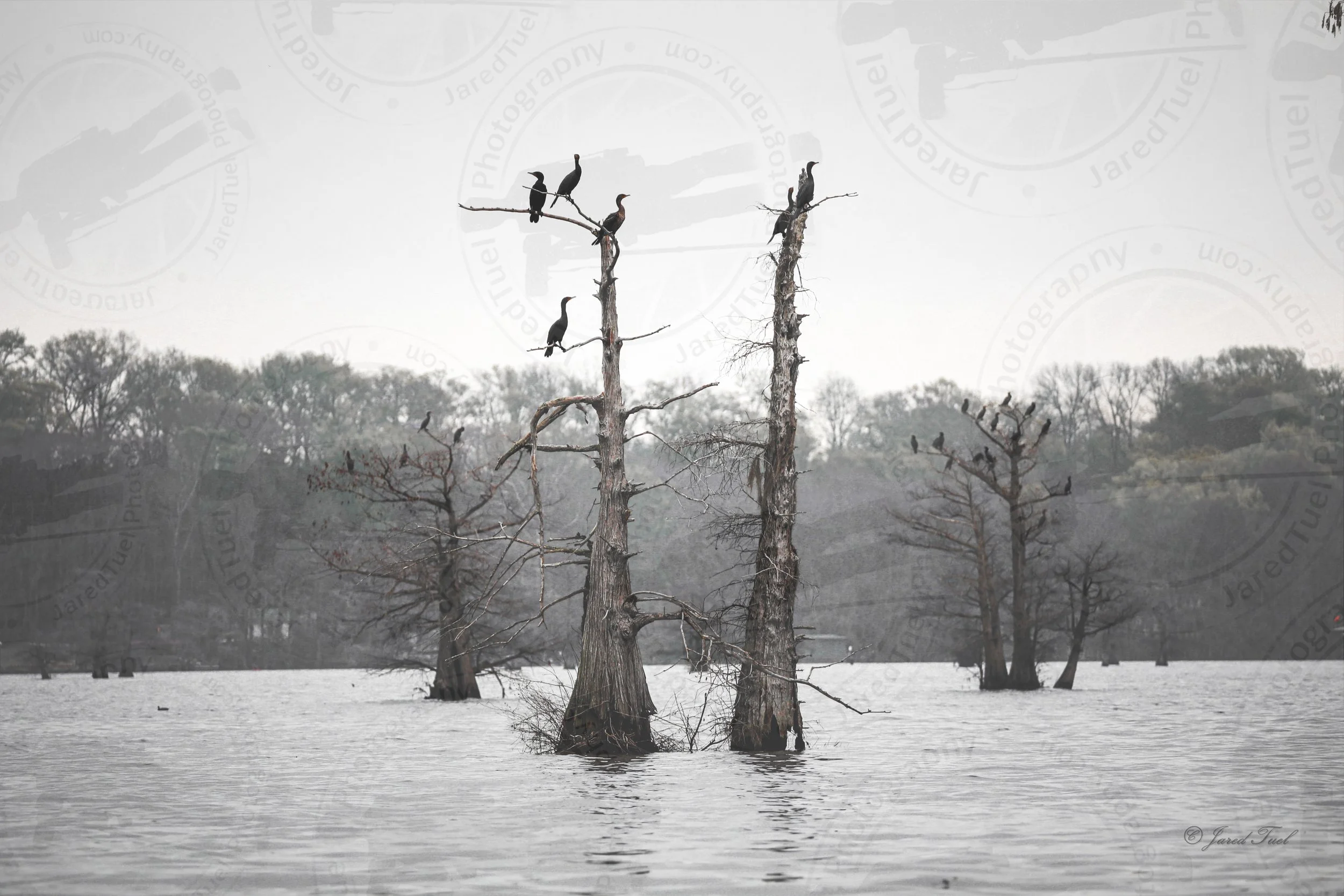 A small gathering of Anhinga (Water Turkey or Snakebird) rest atop bare, weathered trees rising from calm, open water. Their dark silhouettes contrast softly against an overcast sky, while the distant shoreline fades into muted grays. The scene feels hushed and spacious, as if time slows-water gently rippling below, branches standing still above. Together, the birds form a quiet community suspended between sky and water, evoking a sense of calm, balance, and shared stillness.